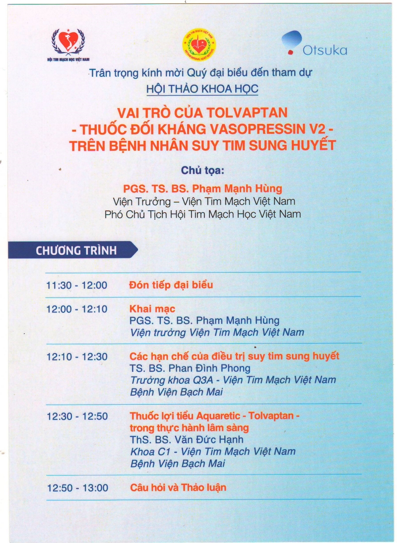 Ngày 11/12/2019 (Thứ Tư) Viện Tim mạch Việt Nam phối hợp với hãng Otsuka tổ chức hội thảo khoa học chuyên đề "Vai trò của Tolvaptan - Thuốc đối kháng Vasopressin V2 trên bệnh nhân suy tim sung huyết" . Chương trình có sự tham gia của PGS.TS. Phạm Mạnh Hùng - Viện Trưởng Viện Tim mạch Việt Nam và TS.Phan Đình Phong - Trưởng phòng Q3A Viện Tim mạch Việt Nam, ThS. Văn Đức Hạnh - Phòng C1 Viện Tim mạch Việt Nam.