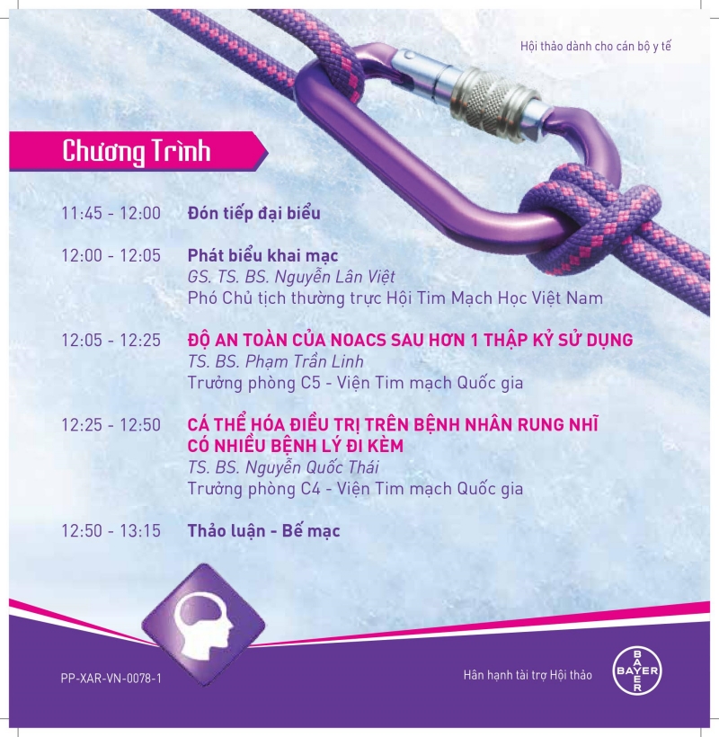 Ngày 24/5/2019 (Thứ 6) Viện Tim mạch Việt Nam, Hội Tim mạch học Việt Nam phối hợp với công ty Bayer tổ chức buổi Hội thảo khoa học "Dự phòng đột quỵ trên bệnh nhân rung nhĩ không do van tim: Cá thể hóa điều trị - Thách thức về độ an toàn khi sử dụng kháng đông lâu dài" với sự tham gia của các chuyên gia tim mạch hàng đầu: GS.TS. Nguyễn Lân Việt - Phó chủ tịch thường trực Hội Tim mạch học Việt Nam, TS. Phạm Trần Linh - Trưởng phòng C5 Viện Tim mạch Việt Nam, TS. Nguyễn Quốc Thái - Trưởng phòng C4 Viện Tim mạch Việt Nam.
