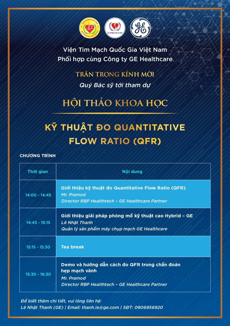 Ngày 08/08/2019 (thứ Năm) Viện Tim mạch Việt Nam phối hợp với Hội Tim mạch học Việt Nam và công ty GE Healthcare tổ chức Hội thảo khoa học "Kỹ thuật đo Quantitative Flow Ratio (QFR)"