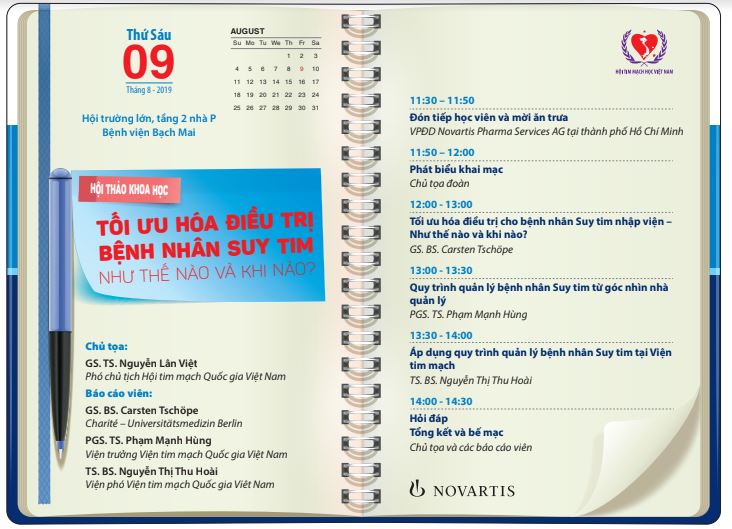 Ngày 09/08/2019 (Thứ Sáu) Viện Tim mạch Việt Nam phối hợp với Hội Tim mạch học Việt Nam và công ty Novartis tổ chức buổi hội thảo sinh hoạt khoa học chuyên đề "Tối ưu hóa điều trị bệnh nhân suy tim. Khi nào và như thế nào ?" với sự tham gia của các chuyên gia đến từ Viện Tim mạch Việt Nam và GS.TS.Carsten TSchope