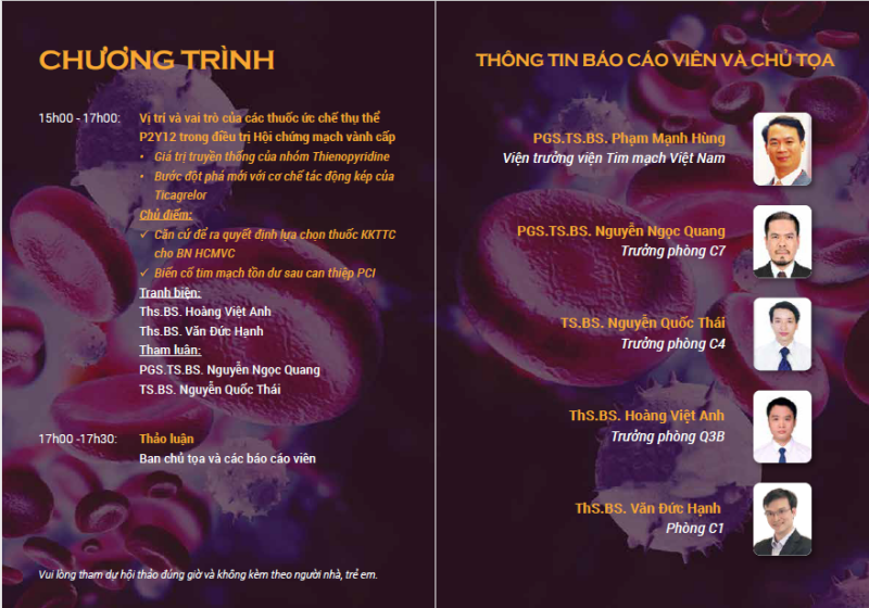 15h00 thứ Năm ngày 13/09/2018 Viện Tim mạch Việt Nam sẽ tổ chức buổi Hội thảo sinh hoạt khoa học "Biến cố tim mạch không dừng lại ở phòng thông tim. Làm thế nào giúp bệnh nhân phòng tránh biến cố tái nhồi máu" với sự tham gia của các chuyên gia Tim mạch hàng đầu đến từ Viện Tim mạch Việt Nam và Bô môn Tim mạch trường Đại học Y Hà Nội.