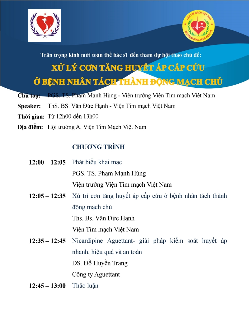 Ngày 22/11/2019 (Thứ 6) Viện Tim mạch Việt Nam phối hợp với công ty AGUETTANT tổ chức buổi hội thảo sinh hoạt khoa học chuyên đề "Xử lý cơn tăng huyết áp cấp cứu ở bệnh nhân tách thành động mạch chủ" với sự tham gia của PGS.TS. Phạm Mạnh Hùng - Viện Trưởng Viện Tim mạch Việt Nam và ThS. Văn Đức Hạnh - Viện Tim mạch Việt Nam.