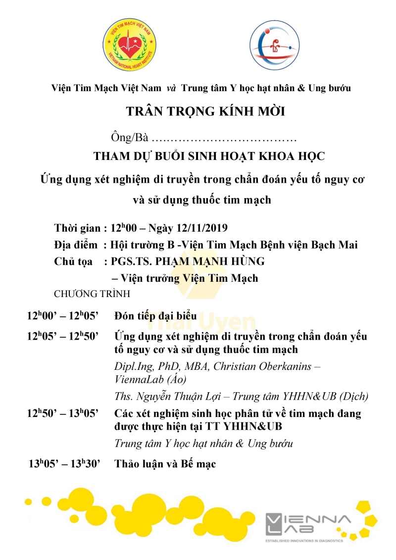 Ngày 12/11/2019 (thứ Ba) Viện Tim mạch Việt Nam phối hợp với Trung Tâm Y học hạt nhân và Ung Bười và công ty Thái Uyên tổ chức Hội thảo sinh hoạt khoa học chuyên đề "Ứng dụng xét nghiệm di truyền trong chẩn đoán yếu tố nguy cơ và sử dụng thuốc Tim mạch". Chương trình có sự tham gia của PGS.TS. Phạm Mạnh Hùng - Viện Trưởng Viện Tim mạch Việt Nam và TS. Dipl.Ing đến từ nước Cộng Hòa Áo.
