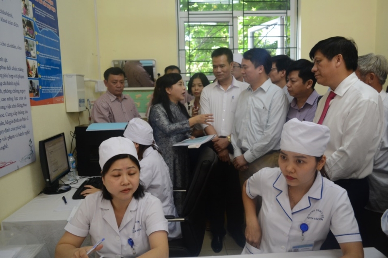 Bộ trưởng Nguyễn Thị Kim Tiến trao đổi với đoàn đại biểu về việc theo dõi và quản lý bệnh nhân tăng huyết áp tại tuyến xa, phường.