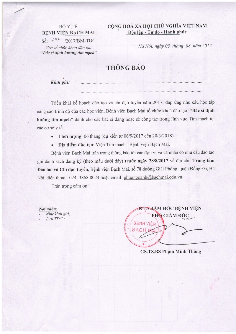 Các cá nhân và đơn vị có nhu cầu đăng ký tham gia khóa đào tạo xin vui lòng liên hệ với Trung tâm đào tạo và Chỉ đạo tuyến bệnh viện Bạch Mai - SĐT: 024 3868 8024 hoặc Phòng Đào tạo Viện Tim mạch - SĐT : 024 3215 1194.