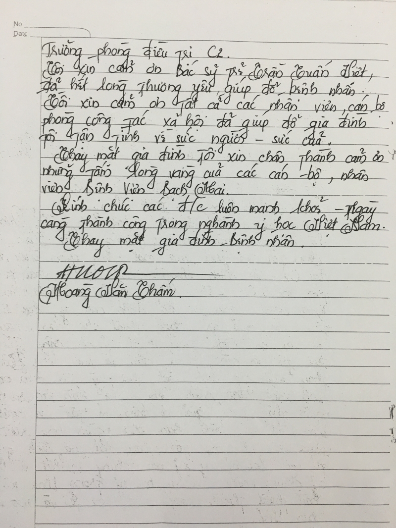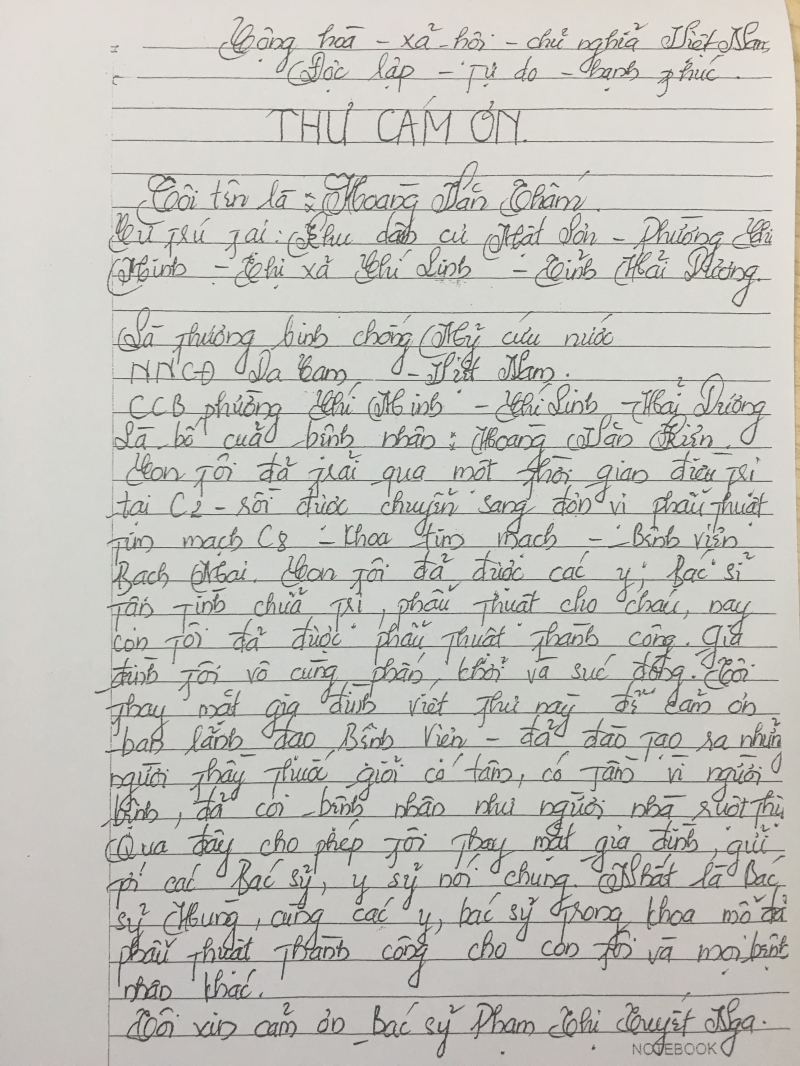 Cảm kích trước tấm lòng hết mình vì bệnh nhân của tập thể cán bộ nhân viên phòng C2 và C8 Viện Tim mạch Việt Nam, ông Hoàng Văn Thấm bố của bệnh nhân Hoàng Văn Kiên trú tại khu dân cư Mật Sơn phường Chí Minh – Thị xã Chí Linh tỉnh Hải Dương đã viết thư cảm ơn cảm ơn tập thể cán bộ nhân viên phòng C2 và C8 Viện Tim mạch Việt Nam, kíp mổ của TS. Dương Đức Hùng và bác sĩ Trần Tuấn Việt là bác sĩ điều trị cho bệnh nhân Kiên.