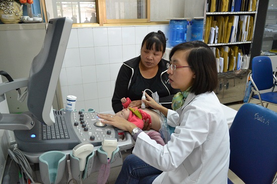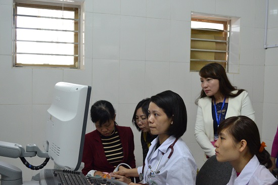 ThS.BS. Nguyễn Thị Duyên siêu âm tim cho trẻ và hướng dẫn bác sĩ của BVĐK tỉnh thực hiện kỹ thuật siêu âm tim