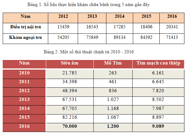 Số lượng bệnh nhân đến khám Tim mạch tại Viện tăng lên không ngừng, đạt 84.000 (2015) lượt bệnh nhân tại phòng khám Tim mạch - Khoa khám bệnh và Đơn vị khám và tư vấn theo yêu cầu do Viện phụ trách. Viện đã tiếp nhận điều trị với năng suất và chất lượng cao cho tất cả các bệnh nhân nặng hoặc bệnh nhân khó về chuyên ngành Tim mạch của hầu hết các tỉnh gửi đến, tuy phải chịu một áp lực nhất định về quá tải so với số giường bệnh, mặc dù đã cố gắng không ngừng để giảm số ngày điều trị nhằm giảm chi phí và giảm quá tải.